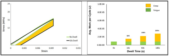In this study, the creep effect is demonstrated by evaluating the damaged work per cycle and comparing it for both conditions of no and 10 s of dwelling. At the no dwelling conditions, the damaged work is related to cyclic fatigue only, since the only effect is mechanical fatigue. The creep effect is considered negligible due to the fast ramp rate employed. This would not allow a considerable creep effect to take place between ramps. However, the damage due to creep is dominant during dwelling, and the damage due to fatigue is acquired between ramps in the case of a combined creep–fatigue test. According to the above, it is assumed that inelastic (damaged) work is caused by fatigue only in the cyclic fatigue test with no dwelling, and inelastic (damaged) work due to creep–fatigue is generated due to the combined effects of creep–fatigue at dwelling conditions. Consequently, the damaged work due to creep is determined approximately by subtracting damage due to fatigue only (at no dwelling) from the one generated in the dwelling experiment. Figure 22, for example, shows the hysteresis loops for both conditions of no dwelling (green-colored) and with 10 s of dwelling (yellow-colored) in addition to a bar chart summarizing the damaged work generated for both cases. For more clarification, the damaged work due to fatigue is colored as green in the bar graph, and the damage due to creep is added accordingly for each case with more extended dwelling periods. Results show that work due to creep increases with longer dwelling times, where the related damage on a life reduction basis is reflected obviously. Despite the amount of inelastic work due to creep being almost similar to fatigue in the case of 10 s dwelling, the reflection on life reduction is massive by reducing life by a factor of 3. The same trends for other stress levels with higher damaged work are noticed due to more damaged being created due to higher stress.