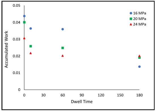 Accumulated work until complete failure vs. dwell time at different stress amplitudes.