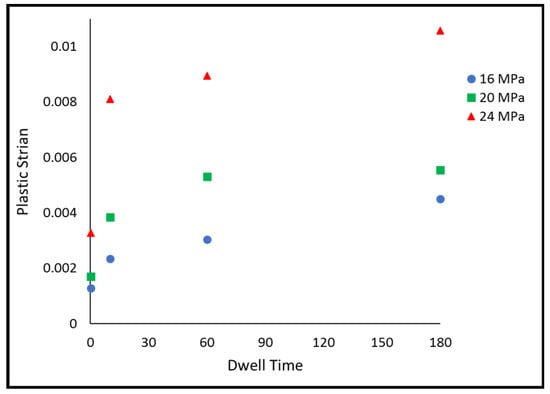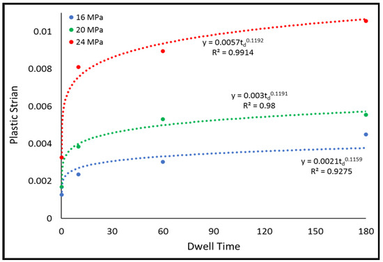 Figure 26 describes the plastic strain as a function of dwell time. It is clearly shown that there is a trend of plastic strain as a function of dwell time at various stress amplitudes. With a high R-square for all curves, data are fitted to a power equation, so the plastic strains can be predicted as a function of dwell time according to Equation (5).