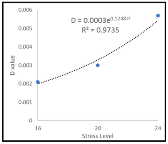 where PS is the plastic strain, D is constant, and td is the dwell time. The D-value could also be formulated as a function of stress amplitude according to Figure 27. Thus, Equation (6) can be expressed as shown in Equation (6). The dwell time’s impact on the value of the plastic strain is depicted by the D coefficient in terms of its magnitude.