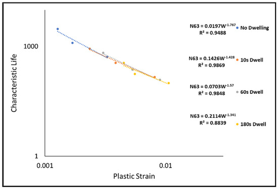 To characterize the reliability model as a function of dwelling, the relationship between characteristic life and stress amplitudes for joints cycled with various dwellings are plotted as shown in Figure 13, where data are fitted to power equations for each dwelling period. A decreasing trend for the power value (the material ductility exponent) is identified when the dwell time is increased. However, the constant C was observed to decrease with dwelling. The R-square values are above 99% for all fitting lines.