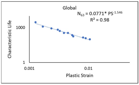 To generate the reliability model (Equation (1)) as a function of inelastic work, the characteristic life equation as a function of plastic work (Equation (12)) must be attained. Therefore, the characteristic life as a function of plastic work is developed from Figure 33 as shown in Equation (13).