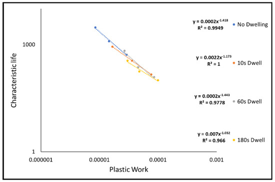 Characteristic life vs. inelastic work for SAC305 joints at various dwelling times on a log–log scale.