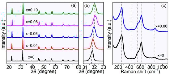Composition-dependent (a) XRD patterns and (b) expanded patterns of KNNSx-BNN ceramics. (c) Raman spectra for KNNSx-BNN ceramics with x = 0 and x = 0.06.