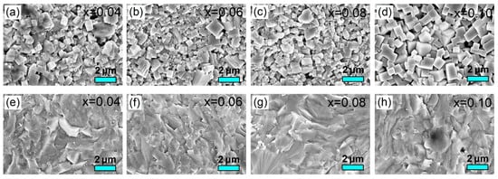 Figure 2 displays the FE-SEM images of KNNSx-BNN ceramics. From Figure 2a–d, all the ceramics show the dense microstructure and nanosized and cubic-type grains. In addition, the grains of the Sb-doped ceramics under solubility limit (x = 0.04–0.08) include the small grains and relatively large grains, while the ceramic at x = 0.10 (over solubility limit) basically shows the relatively large grains with tiny amounts of small grains. This result indicates that excessive Sb doping can facilitate the grain growth as the sintering adds. From Figure 2e–h, which shows the cross-sectional microstructure, all the ceramics display transgranular fracture behavior, indicating the quite dense microstructure for KNNSx-BNN ceramics. Figure 3a gives the evolution of average grain size as a function of x for KNNSx-BNN ceramics. Before doping Sb, the average grain size of ceramic is about ~900 nm at x = 0 [22]. After introducing Sb, the average grain size decreases to ~340–400 nm at x = 0.06–0.08 and then increases again to ~700 nm at x = 0.10. This result demonstrates that the doping Sb into a KNN-based lattice can lead to the reduction of grain size, while doping more Sb will make the grain size improvement again due to the sintering-aiding effect of abundant doping ions. In this process, the density of ceramics shows the total inverse changing tendency with increasing Sb content because a lesser amount of pores and gaps will present between smaller grains. Therefore, the larger the grain size that is obtained, the lower the ceramic density will show, and the smaller the grain size that is obtained, the higher the ceramic density will show. In addition, the increasing grain boundary density caused by grain size reducing will bring about the increasing inner stress within ceramics.