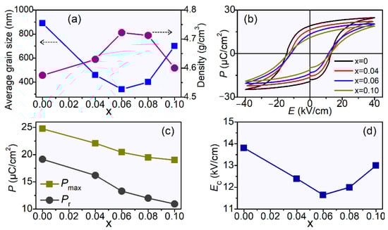 Figure 3b shows the polarization–electric field (P-E) loops of KNNSx-BNN ceramics as a function of x. It can be seen that all the ceramics exhibit typical and saturated P-E loops. With increasing x, both the maximum polarization Pmax and remnant polarization Pr decreases. As shown in Figure 3c, the Pmax decreases from ~24.7 μC/cm2 (x = 0) to ~19.0 μC/cm2 (x = 0.10), and the Pr decreases from ~19.1 to ~10.9 μC/cm2 when the composition is elevated from x = 0 to x = 0.10. This result indicates that the addition of Sb will reduce the ferroelectric polarization of KNN-based ceramics [25,26]. In addition, the evolution of the coercive field Ec as a function of x is quite similar with the variation of grain size. That is, the Ec of ceramic decreases from ~13.8 kV/cm (x = 0) to ~11.7–12.0 kV/cm (x = 0.06–0.08), and then increases to ~13.0 kV/cm at x = 0.10. The large grains usually possess the large ferroelectric domains, and the large domains usually need a high electric field to switch the domains. Therefore, the coercive field is usually positively correlated with grain size.