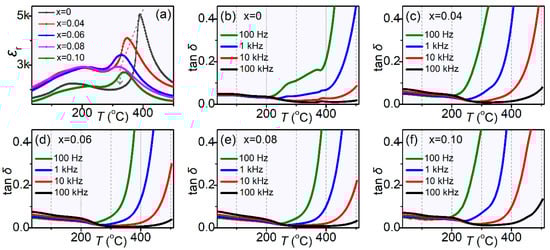 (a) Composition-dependent εr-T curves as a function of x for KNNSx-BNN ceramics. Temperature/frequency dependence of tan δ-T curves of KNNSx-BNN ceramics with (b) x = 0, (c) x = 0.04, (d) x = 0.06, (e) x = 0.08 and (f) x = 0.10.