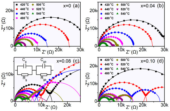 The electrical conductivity of normal ferroelectric ceramics is quite small at low temperature, and it is difficult to observe obvious carrier migration behavior at low temperature. Therefore, the complex impedance semicircle can only be observed under relatively high temperature, at which an obvious carrier migration can happen. Thus, for most of the KNN-based ferroelectric ceramics, a high temperature of >300–400 °C is usually necessary to measure the effective complex impedance [20,22]. Figure 5 gives the complex impedances of KNNSx-BNN ceramics over 400 °C. First, it can be seen that the real impedance decreases with increasing temperature, that is, the conductivity of ceramics will increase when the temperature is elevated. Second, there is only one impedance semicircle at x = 0, and this impedance semicircle should mainly result from the grain impedance [20]. With increasing x to 0.04, there is still one impedance semicircle showing grain effect-induced impedance, while it begins to form the secondary impedance semicircle at low frequency. When x is elevated to 0.08, it can clearly see the secondary impedance semicircle at low frequency, which mainly results from the impedance induced by grain boundaries [20], and the first impedance semicircle at the high frequency region derives from the grain impedance. This result indicates that the grain and grain boundary impedances both decrease after Sb doping. That is, the electrical conductivity of grain and grain boundary both increase after Sb doping. However, with increasing x to 0.10, the grain impedance semicircle becomes big again, while the grain boundary-induced impedance semicircle becomes more observable, indicating that the grain conductivity decreases and the conductivity of the grain boundary begins to show a dominant effect on the electrical conductivity of ceramics at x = 0.10. The equivalent circuit consisting of bulk grain/grain boundary resistance (Rg and Rgb) and grain/grain boundary capacitance (Cg and Cgb) by parallel combination way (as shown in Figure 5c) was employed to evaluate the evolution of grain/grain boundary resistance, as shown in Table 2. Previous results have confirmed that grain size will decrease after Sb doping and then increase again after more Sb doping. In this process, the amounts of grain boundary will rapidly increase when grain size reduces. Therefore, the grain contribution on ceramic conductivity will decrease when grain size reduces, meanwhile the grain boundary contribution on ceramic conductivity will increase when the amounts of grain boundary increase. However, the grain contribution still shows the dominant role on ceramic conductivity when x ≤ 0.08, as shown in Figure 5a–c. After introducing more Sb with x = 0.10, the grain size increases again; therefore, the grain conductivity decreases. Because the redundant doping Sb will enter into the grain boundary when x = 0.10, which can facilitate the conductivity of grain boundary, the conductivity of the grain boundary still increases and shows a dominant role on ceramic conductivity at high temperature although the amounts of grain boundary become less, as shown in Figure 5d. The increasing conductivity of the grain and grain boundary can facilitate the carrier migration, and can thus lead to improvement of the dielectric property. From Figure 4a, the evolution of a room-temperature dielectric constant is quite similar with the variation of grain and grain boundary conductivity for KNNSx-BNN ceramics.