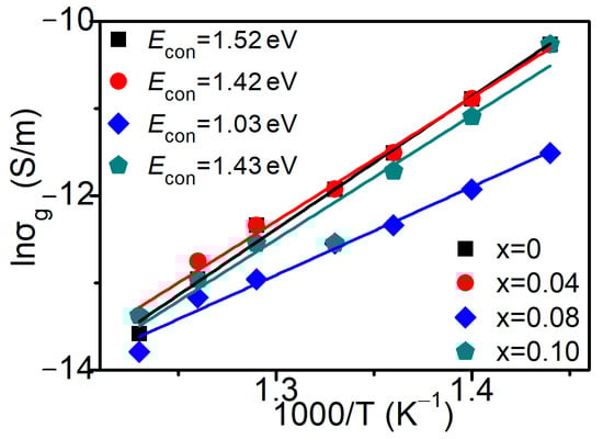 where 𝜎g and 𝜎0 are the conductivity and initial conductivity of the grain, 𝑘B is the Boltzmann constant, 𝑇 is the absolute temperature, and Econ is the conductance activation energy. As shown in Figure 6, it can be seen that the activation energy first decreases from 1.52 to 1.03 eV when the content of doping Sb increases from x = 0 to x = 0.08, and then, the activation energy increases again to 1.43 eV with increasing Sb doping content to x = 0.10. The high activation energy indicates that the migration for carriers is difficult; thus, the impedance/resistance is large and the electrical conductivity will be low, and vice versa. Therefore, the doping Sb can lead to a decrease in activation energy for the ceramic grain, and the large grain usually possesses the higher activation energy.
