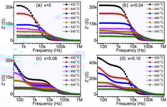Frequency/temperature-dependent real parts of impedances for KNNSx-BNN ceramics with (a) x = 0, (b) x = 0.04, (c) x = 0.08 and (d) x = 0.10 measured at high temperature.