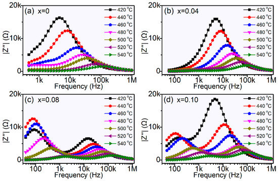 Figure 8 displays the imaginary part of impedance (reactance) for KNNSx-BNN ceramics. It can be seen that the imaginary part of the impedance first increases and then decreases with increasing frequency from low to high values at x = 0 and 0.04. Furthermore, the reactance peak gradually becomes low and shifts to a high frequency region when the measuring temperature is elevated. This phenomenon indicates that the reactance shows relaxation behavior. For the composition at x = 0.08, two reactance peaks can be seen. There is a new reactance peak in the low-frequency region. According to the above result, the grain boundary contribution is significant in this composition; thus, this new reactance peak should mainly derive from the grain boundary contribution. Therefore, the reactance peak at medium frequency should mainly result from the grain contribution. When the composition is elevated from x = 0.04 to x = 0.08, it was found that the peak intensity of medium-frequency reactance decreases, while the low-frequency reactance peak is quite obvious. That is, the grain boundary contribution becomes significant for ceramic reactance. When the composition is elevated to x = 0.10, the low-frequency reactance peak is also obvious, while the medium-frequency reactance peak increases again, indicating the improving grain contribution again, which is well consistent with the above results.