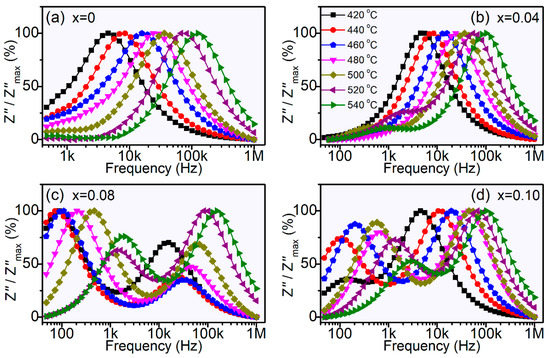 For further clarity illustrating the frequency dependence of impedance, the normalized imaginary part of impedance (normalized reactance) was obtained, as shown in Figure 9. Firstly, there is only one normalized reactance peak at x = 0 (Figure 9a). According to the above results, this peak is mainly contributed by grain conductivity. After introducing Sb, an emerging new reactance peak appears in low frequency and high temperature at x = 0.04 (Figure 9b). When the content of doping Sb is elevated to x = 0.08 and 0.10, the low-frequency normalized reactance peak can be clearly observed (Figure 9c,d). This phenomenon indicates that the grain boundary conductivity actually begins to show an observable contribution at high temperature from x = 0.04 and then possesses a significant contribution at x = 0.08 and 0.10. This result implies that partial doping Sb ions have entered into the grain boundary from x = 0.04, thus leading to the increasing grain boundary conductivity after Sb doping. Conversely, the low-frequency side of the normalized reactance peak is mainly contributed by DC conductivity, and the high-frequency side of the normalized reactance peak is mainly contributed by AC conductivity [31]. It can be seen that both of the low-frequency and medium-frequency reactance peaks gradually shift to a high-frequency region when the measuring temperature is elevated, demonstrating that the DC conductivity becomes more obvious and can present in a broader frequency range at high temperature due to both the grain and grain boundary contribution.