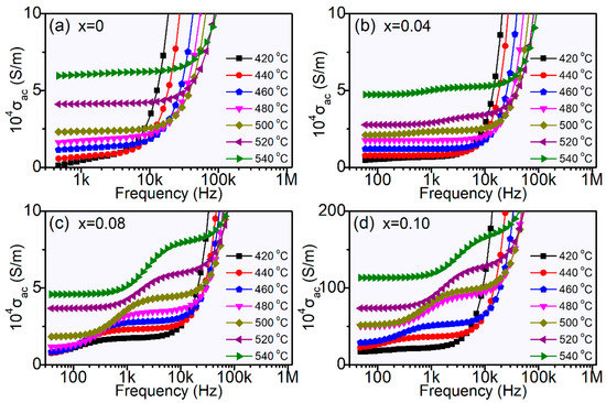 Figure 10 gives the AC conductivity (σac) as a function of temperature and frequency. There is one flat conductivity region at the low-frequency range for the composition at x = 0 and 0.04. This flat conductivity region indicates that the long-range motion of the carrier dominates the conductivity in this frequency range [32]. When the composition is elevated to x = 0.08 and 0.10, two conductivity flats can be observed in the low-frequency range. These two flats should result from the grain and grain boundary contribution after high-content Sb doping based on the above results. With increasing the frequency over the flat conductivity region, the σac of all the ceramics increases sharply to a large value, and the critical frequency is about ~10 kHz when the ceramics have high AC conductivity. Under this state, the ceramic conductivity mainly results from short-range carrier jumping. In addition, it was found that the AC conductivity of ceramic at x = 0.10 is much higher than the ceramic at x = 0-0.08. The prominent grain boundary conductivity as well as the high grain conductivity should contribute to this result. For the ceramics at x = 0-0.08, although the grain boundary conductivity gradually increases with increasing doping content, it is still more inferior than the ceramic at x = 0.10.