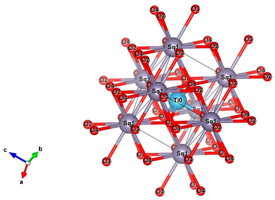 Figure 1 depicts the cubic SnTiO3 crystal structure. It crystallizes in the cubic Pm3m symmetry group. This structure was obtained from the database Materials project (https://materialsproject.org/, accessed on 13 September 2022). Sn atoms are found in the cell’s corners, oxygen atoms are found in the middle of each edge, and the only Ti atom is found in the cell’s center.