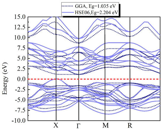 The electronic properties of studied perovskite SnTiO3 were determined by its energy band structure, total and partial density of states (TDOS and PDOS). In this study, the HSE06 approach was applied in order to enhance the band gap accuracy in semiconductors. In Figure 2, we show the band structures as calculated by HSE06 and GGA. With HSE06, we obtained an indirect gap (X-Γ) of 2.204 eV, whereas GGA is leading to an indirect gap of 1.035 eV. Compared to recent theoretical works performed using GGA-PBE and GGA-PBESol where the band gaps were found to be 1.164 eV and 2.445 eV, respectively [46,47], our band gap is approaching the experimental value as reported in [47,48]. In addition, band structure simulations using the hybrid functional HSE06 classify both projected high-pressure polymorphs as indirect gap semiconductors with marginally smaller band gaps than tetragonal PbTiO3 (PBE: 2.08 eV, exp. 3 eV, as indicated in references [47,48]). The calculated values for the two theoretically anticipated polymorphs of SnTiO3 at 1.87 eV for [BaTiO3]-type and 1.95 eV for [CaTaO2N]-type are relatively close because of a similar bonding condition.
