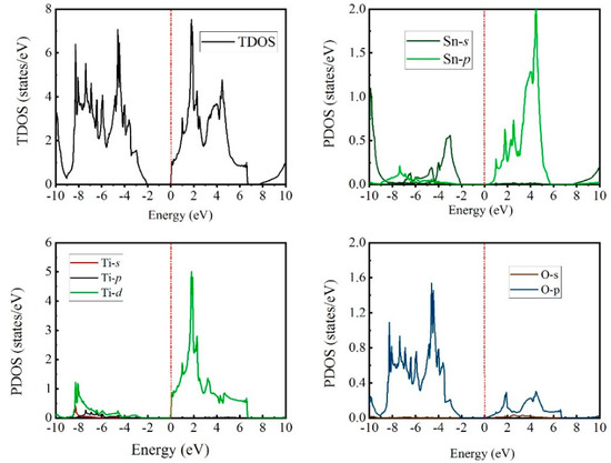 The density of states depicts how different states are broken up. The crystalline field and electrostatic interactions between O-2p orbitals influence this, as shown in Figure 3. The Fermi level’s topmost valence band is chosen as zero, and the energy scale is measured in electron volts (eV). The compound exhibits an indirect bandgap of 2.204 eV between the upper part of the valence band at point X and the lower part of the conduction band at the point (Γ-X), as can be observed. In SnTiO3, the O-2p and Ti-3d orbitals belong to the valence and conduction bands, respectively. Between Sn and O, there is a lot of covalent bonding. The good behavior of ferroelectric material in the SnTiO3 compound is confirmed by this covalent bonding [49]. Furthermore, the upper valence band is dominated by O-2p electrons for all compositions of compounds, and the lower valence band originates from Ti-3d, Sn-5p.