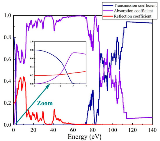 In Figure 5, we have plotted the optical spectrum: absorption, reflection and transmission. In the beginning, at 0 eV, the material is in transmission mode with 80% of the transmission coefficient and 20% of reflection. The absorption is zero and starts increasing from energies around 1 eV. At 2.2 eV, the absorption is 34%, whereas T falls to 40% and R is stable to 22%. The maximum absorption is reached around energy of 3 eV with 73% corresponding to zero transmission and 27% of reflection, suggesting that absorption is maximum in the ultraviolet region.