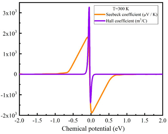 The Seebeck coefficient and the Hall coefficient versus the chemical potential at room temperature.