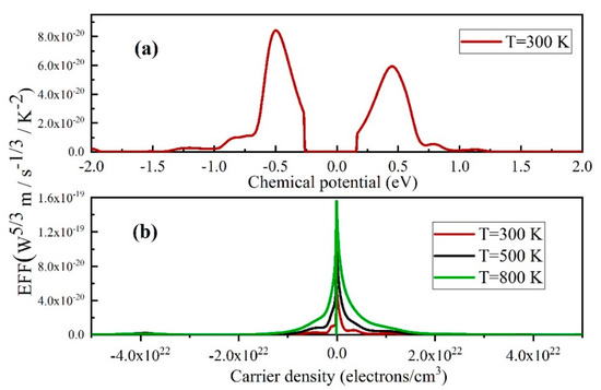 The EFF vs. chemical potential at room temperature and carrier density for three different temperatures—300, 500, and 800 K—are displayed in Figure 8a,b. Between the p-type and n-type, the EFF versus chemical potential exhibits an asymmetric tendency.