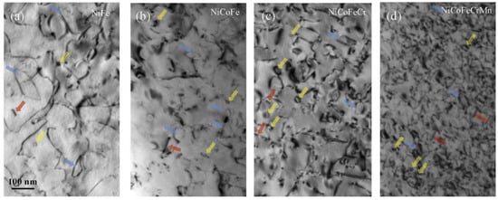 The lattice atom leaves the initial position after being bombarded by high-energy particles when alloys are subjected to irradiation, and results in the generation of a Frenkel pair. The accumulation and translocation of Frenkel pairs lead to the formation of complex defect structures, such as point defect and line defect stacking defect tetrahedrons, dislocation loops, precipitations, voids and He bubbles [21]. The defect growing in CCA is restrained due to the self-healing effect, resulting in better irradiation resistance of CCA than conventional alloys. Figure 2 displays the dislocation loops distribution in nickel-based CCAs after irradiation. The alloys show denser and smaller dislocation loops with the increasing mixing entropy. The single phase Al0.1CoCrFeNi exhibits great structure stability against precipitate at ~43 dpa 3 MeV Au ion irradiation [22]. The stable stacking fault tetrahedron forms in FeCrCoNi CCA under the high dose 1.5 MeV Ni ion irradiation [23]. Compared with 304 SS and pure nickel, the CrMnFeCoNi CCA exhibits smallest helium bubble size and densest stacking fault tetrahedron [24]. The vacancy formation is also difficult in CCA. Xu et al. [25] studied the formation of vacancy clusters in CoCrFeMnNi CCA using first principle calculation and experiment, and found it is difficult to form tri-vacancy clusters, which is the reason for the good irradiation resistance of CCA.