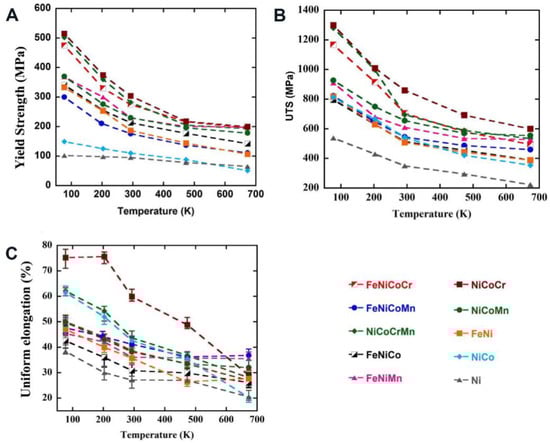 Temperature dependence of (A) yield stress, (B) ultimate tensile stress and (C) uniform elongation to fracture for equal atomic alloys and Ni, reprinted with permission from Ref. [27].