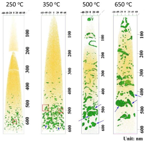 The dislocation loops in Al0.1CoCrFeNi CCA when irradiated under 3 Mev Au ion beam at 250, 350, 500 and 650 °C is characterized by atom probe tomography (APT). The size and density of dislocation loops grows with the irradiation temperature, reprinted with permission from Ref. [49].