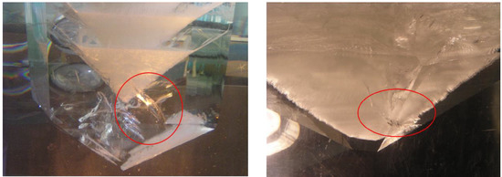 KDP (KH2PO4, potassium dihydrogen phosphate) crystals, which are the nonlinear crystals used for electro-optic switches and frequency converters in inertial confinement fusion technology [], are required to be on a large scale, with linear dimensions in the 50–100 cm range []. Traditional slow-cooling growth is still the dominant method for producing such large crystals. During the conventional growth process, the cap region forms after the regeneration of a Z-plate seed of KDP crystal, that is, a solid region or a box-like structure, depending on the temperature reduction rate in the early stages of crystal growth []. The cracking of a large KDP crystal sometimes occurs during the growth process, especially after the regeneration of a Z-plate seed of KDP crystal is complete. Cracks mainly start from the apex of the cap region, as seen in Figure 1. At larger sizes of crystal seeds, the possibility of cracking is even higher.