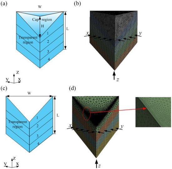 (a) Schematic diagram of the calculation model, including the cap region; (b) stress computation grids applied with structure constraints; (c) schematic diagram of the calculation model without including the cap region; (d) stress computation grids applied with structural constraints.