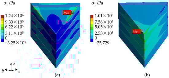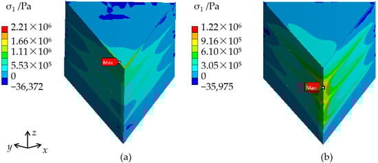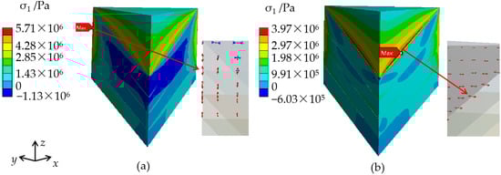 Figure 10 shows the stress distribution inside a 50 cm KDP crystal, calculated from the CTE setting in Table 4 without including the cap region. When the CTE only changes along the x-axis, the computed maximum σ1 position shown in Figure 10a is the same as in Figure 8b, and the maximum σ1 value slightly decreases from 2.8 MPa to 2.21 MPa. When the CTE only changes along the z-axis, high stresses concentrate on the junction points of the two parts of the transparent region, which is different from the actual crystal cracking position, as seen in Figure 1. Moreover, the maximum σ1 value is less than that in Figure 10a. Therefore, it is rational to demonstrate that the mismatch of CTE along the x-axis is the main reason for the crystal stress.