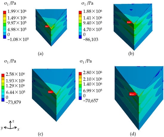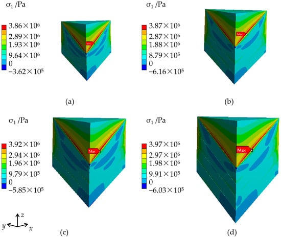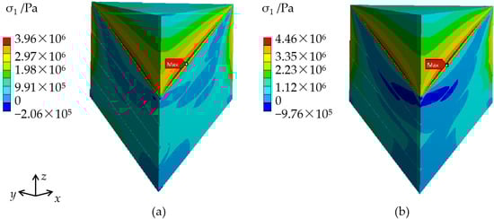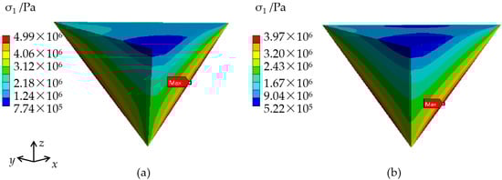 Figure 3 shows the stress distribution corresponding to the maximum principal stress, σ1, inside the KDP crystal under two change trends of the CTE. The positive and negative stress values demonstrate that the crystal is in tension and compression, respectively. The maximum stress value is listed in Table 2. In case 1 of incremental CTE from the cap region to the growth front, the maximum stress of 5.71 MPa is at the edge of the outside surface, as denoted by the small red flag labeled “Max” in Figure 3a. High stresses occur in the cap region and the crystal periphery. The stress is very small, even for compressive stress in the interior of the transparent region. In case 2, the maximum stress is 3.97 MPa, located at the edge of the cap region; this location is consistent with the actual crack initiation position, as seen in Figure 1. High stresses are also distributed in the cap region. Nevertheless, stresses inside the pure crystal are larger than those in case 1, and no compressive stress occurs.