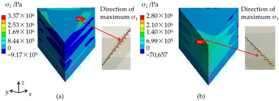 Stress distribution and the direction of maximum σ1 in KDP crystals without including the cap region: (a) case 1 (CTE gradually increases from the cap region to the growth front), (b) case 2 (CTE gradually decreases from the cap region to the growth front).