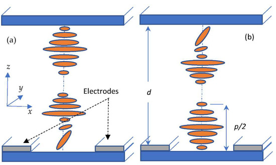 We prepared two types of samples with hybrid boundary conditions, where at one of the surfaces of the substrate the planar conditions for the CLC alignment were made, while on the other substrate (opposite boundary of the layer) the conditions were for the homeotropic alignment. In the first type (A), seen in Figure 1a, the homeotropic alignment was set on the surface of the substrate with an interdigitated system of chrome electrodes. In the second case (B), seen in Figure 1b, similar electrodes were placed on the surface of the substrate providing planar-alignment conditions. The easy axis of the planar alignment was oriented along the electrode’s stripes.