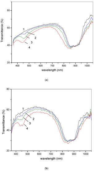 Transmittance spectra for samples “A” (a) and “B” (b) at different magnitudes of the driving voltage Up-p: 0, 100, 200, and 300 V for the curves 1, 2, 3, and 4, respectively.