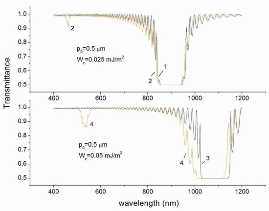 Optical transmittance spectra with the electric field switched off (curves 1, 3) and switched on (curves 2, 4) at voltage U = 100 V for two values of the zenithal anchoring energy on the homeotropic-alignment surface: Wz = 0.025 mJ/m2 (top); Wz = 0.05 mJ/m2 (bottom).