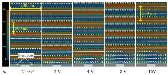 Equilibrium distribution of the LCD director near the homeotropic-alignment surface with weak anchoring (Wz = 0.01 mJ/m2) for different values of voltage on interdigitated electrodes (electrode width 500 nm; gap between electrodes 200 nm). Images correspond to the xz plane (x-axis is horizontal direction, perpendicular to the electrode strips; the z-axis is vertical (normal to the plane of the CLC layer and corresponds to the spiral axis). The color scale corresponds to the x-component of the LC director.