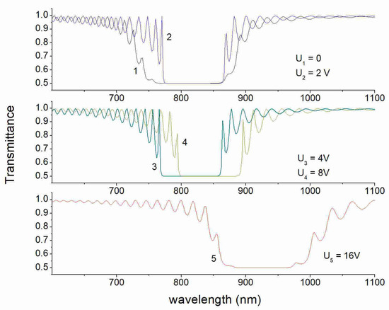 Transmittance spectra of the CLC layer for different values of electrical voltage U on the interdigitated electrodes: (1) U = 0 V; (2) U = 2V; (3) U = 4V; (4) U = 8V; (5) U = 16V. The corresponding director distributions are shown in Figure 5.