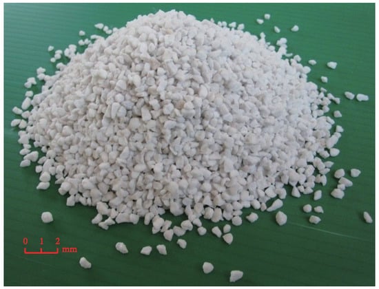 As one of the main aggregates of the GCIB, the main chemical components are SiO, AlO, CaO. There are different types of vitrified microspheres, which are granular and different in appearance. The size range of vitrified microspheres is 0.1–2 mm, which can be divided into 20–30 mesh, 30–50 mesh, 50–70 mesh, 70–90 mesh and 90–120 mesh according to the size; the appearance of 20–30 mesh vitrified microspheres is as shown in Figure 1. For different sizes of vitrified microspheres, the bulk density is 50–100 kg/m, the thermal conductivity is 0.028–0.048 W/m · K, the floating rate is greater than 95%, the vitrification rate of the ball is greater than 95%, the water absorption rate is less than 50% and the melting temperature is 1200 °C. The density of vitrified microspheres is far lower than that of mortar, and the thermal conductivity is significantly lower than that of mortar.