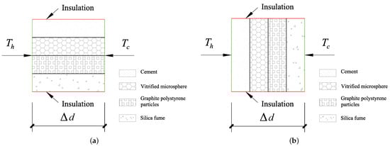 Since the GCIB is composed of four component materials, in order to obtain the upper and lower limit values of the equivalent thermal conductivity, we assume that the combination of the four materials has two theoretical models, parallel and series, as shown in Figure 5, in which and represent the temperature loads on both sides of the insulation board, respectively.