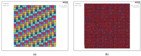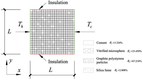 The thermal conductivity of the GCIB is analyzed numerically by using the higher steady state method [,,]. Planar thermal unit PLANE55 is selected to simulate various materials in the GCIB. The density, mass ratio and thermal conductivity of each component material are shown in Table 1. According to the assumption, since the four component materials are uniformly distributed and dense in the GCIB, the randomly distributed unit numbering program is compiled using Python to establish the calculation and analysis model of the four randomly distributed and dense materials, as shown in Figure 6. According to Figure 6, the finite element model of the GCIB is established by using ANSYS, as shown in Figure 7, which includes the four component materials shown in Table 1, where L = 1 is the size of the heat conduction unit. Since the steady state method is used for numerical simulation, the upper and lower boundary conditions of the finite element model are set to the ideal thermal insulation state, and the left and right ends are, respectively, constant temperature boundaries ( and ) along the X axis. We construct different temperature loads on the left and right sides of the finite element model, respectively, and set the upper and lower sides of the Y axis as the insulation boundary state.