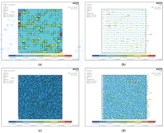 Calculation results of thermal conductivity of the improved GCIB: (a) the heat flow density cloud chart (400 units); (b) the heat flow density vector chart (400 units); (c) the heat flow density cloud chart (10,000 units); (d) the heat flow density vector chart (10,000 units).