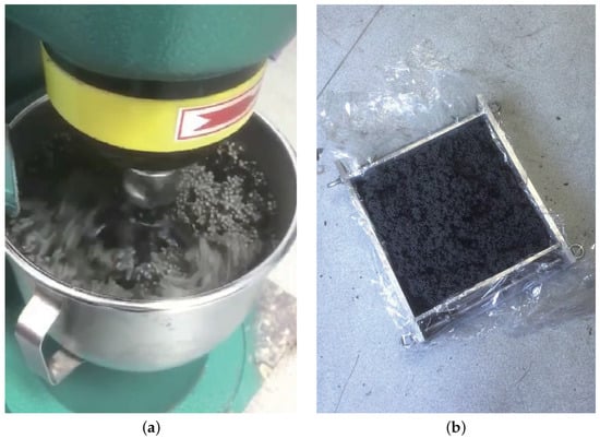 The interior of the GCIB is mainly cemented by aggregates and cementitious materials, mainly consisting of cement, vitrified microspheres, graphite polystyrene particles and silica fume. In order to meet the requirements of thermal conductivity and fire protection in the building code, a DRCD3030 intelligent thermal conductivity tester, electronic balance and other major equipment are used to measure the thermal conductivity according to the lightweight aggregate standard [] and the guarded hot plate method []; the component ratios and thermal conductivity of each material of the improved GCIB are shown in Table 1. Among them, vitrified microspheres and graphite polystyrene particles are the main thermal insulation materials. Cement, as the main cementing material, forms a slurry after adding water to firmly cement the vitrified microspheres and graphite polystyrene particles together. Silica fume, as an additive, can improve the tensile strength, compressive strength, wear resistance, corrosion resistance and flame retardancy of GCIBs, and also reduce the cost of products.