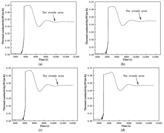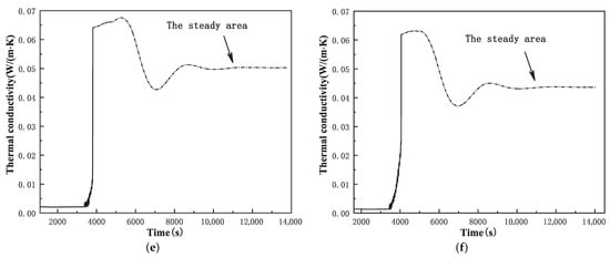 Through the tests on 6 groups of samples, we obtained the process change curve of the thermal conductivity in the GCIB, as shown in Figure 14. When the thermal conductivity test reached a steady state, the temperature of the cold zone was kept at 15 °C and the temperature of the hot zone was kept at 35 °C.