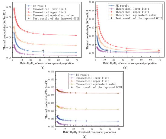 According to (14), (24) and (25), the theoretical thermal conductivity of GCIBs under different material ratios can be obtained. Then, according to Section 4.3 and Section 5.3, the theoretical results, numerical simulation results and experimental results are compared, as shown in Figure 15.