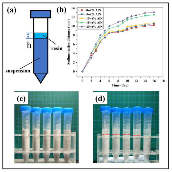 (a) Diagram of sedimentation distance; (b) Sedimentation height of the suspensions with different content of AlN after different times; (c) Photograph of sedimentation distance after 0 days; (d) Photograph of sedimentation distance after 14 days.