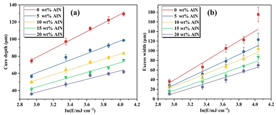 To demonstrate the influence of AlN powders on the curing behavior of suspensions, cure depth, and excess cure width of the suspensions with 50 vol% solid loading were measured and presented in Figure 3. Cure depth (Cd) can be calculated below [30]: