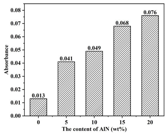 The cure depth and excess width were increased with the enhancement of energy in Figure 3. Besides, cure depth and excess width decreased with the increase of AlN content, which indicates that AlN as an additive has adverse effects on the cure capability of the ceramic suspension. However, lower excess width can be beneficial to the high printing precision during the process of DLP [30]. To characterize the effect of AlN content on the cure capability, Sd, Sw, and Db were calculated according to Equations (4)–(6). The results are presented in Table 1. It shows that Sd, Sw, and Db of Al2O3-AlN suspensions are reducing with the increase of AlN content. Sd, Sw, and Db decrease from 50.06 to 25.07 µm, 101.39 to 52.31 µm, and 42.23 to 19.36 µm, respectively, which can bring better control of the printing precision. As AlN powders absorb more ultraviolet light, it results in the decline of cure ability. The absorptance of the ceramic powders, with AlN powders content varying from 0 to 20 wt%, was measured in 405 nm wavelength to prove the conclusion. As presented in Figure 4, the absorbance of the Al2O3-AlN increased four times at least compared with the Al2O3 powders, and it also raised with the increase of AlN content, which confirms the above inference.