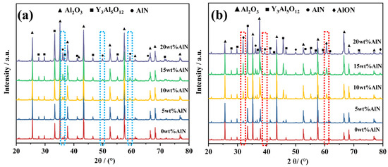 Normalized XRD patterns of Al2O3-AlN composites at different temperatures: (a) 1650 °C, (b) 1700 °C.