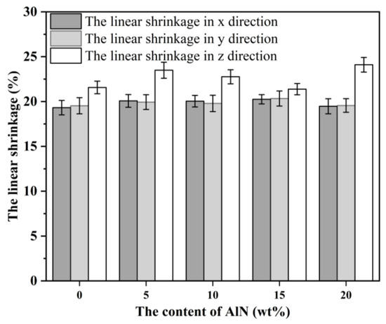 After debinding, the ceramic samples were sintered at 1600 °C, 1650 °C, and 1700 °C for 2 h with nitrogen gas, respectively. The phase compositions of the Al2O3-AlN ceramic samples with different AlN content and sintering temperature are shown in Figure 5. The sintered samples at 1650 °C are composed of Al2O3, AlN, and YAG (Y3Al5O12) phases, and the sintered samples at 1700 °C consist of Al2O3, AlN, YAG, and AlON phases. These phenomena are consistent with other relevant research results [19,20]. The AlON formed by the reaction between Al2O3 and AlN will have a negative impact on the properties of ceramics. As can be seen in Table 2, the relative densities of specimens with different AlN content were all below 80% at 1600 °C because of insufficient sintering driving force, which resulted in the non-densified ceramics. The linear shrinkage of the sintering bodies at 1650 °C with different AlN content is shown in Figure 6. There is no significant difference in the contraction of samples with different content of AlN in the x, y, and z directions. The shrinkage of samples with the same AlN content in the z direction is larger than that of samples in the x and y directions. This may be attributed to the deposition of particles in the spreading layer caused by squeegee movement during the printing process, as well as the rearrangement and densification of particles caused by gravity along the z direction during the sintering process [31]. Relative densities of the samples were improved significantly when the sintering temperature was raised to 1650 °C. However, the relative densities decreased as the sintering temperature increased from 1650 °C to 1700 °C, which may be due to the formation of AlON. The reaction of Al2O3 and AlN at 1700 °C can be presented below [19]: