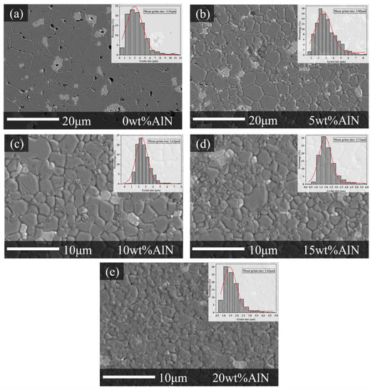 Microstructure and grain size distribution at 1650 °C 2 h: (a) 0 wt% AlN; (b) 5 wt% AlN; (c) 10 wt% AlN; (d) 15 wt% AlN; (e) 20 wt% AlN.