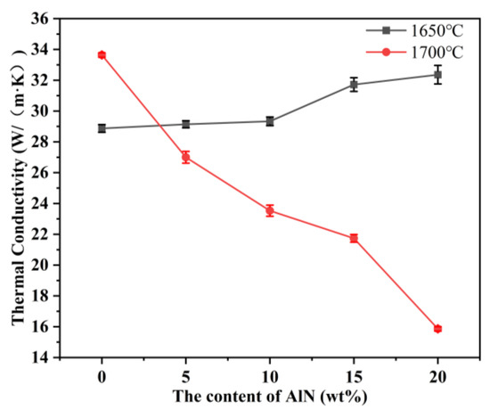 The effect of AlN content on the thermal conductivity of samples at different sintering temperature are displayed in Figure 8. When AlN content was increased from 0 to 15 wt% at 1650 °C, the thermal conductivity of Al2O3-AlN ceramics improved from 28.87 to 31.72 W/(m·K). As AlN has a higher thermal conductivity compared with Al2O3, it is conducive to improving thermal conductivity of Al2O3-AlN ceramics. When AlN content increased from 15 to 20 wt%, the improvement of thermal conductivity was slow, only increasing from 31.72 to 32.36 W/(m·K). This phenomenon can be attributed to grain refinement and the decline of density, which enhanced phonon scattering and decreased the phonon mean free path [3]. Besides, the thermal conductivity of Al2O3-AlN composites at 1700 °C decreased as AlN content increased, which may be due to the formation of AlON. The XRD spectrum was normalized to compare the intensity of diffraction peaks of the AlON. The intensity of the AlON diffraction peak increased significantly when AlN content increased in Figure 5b. AlON has low thermal conductivity [19] (about 10 W/(m·K)) and increases porosity in sintered body, which results in the decline of thermal conductivity rapidly at 1700 °C.